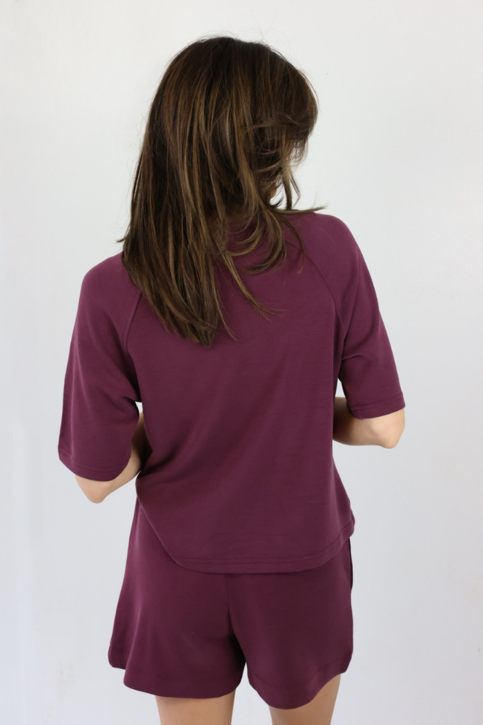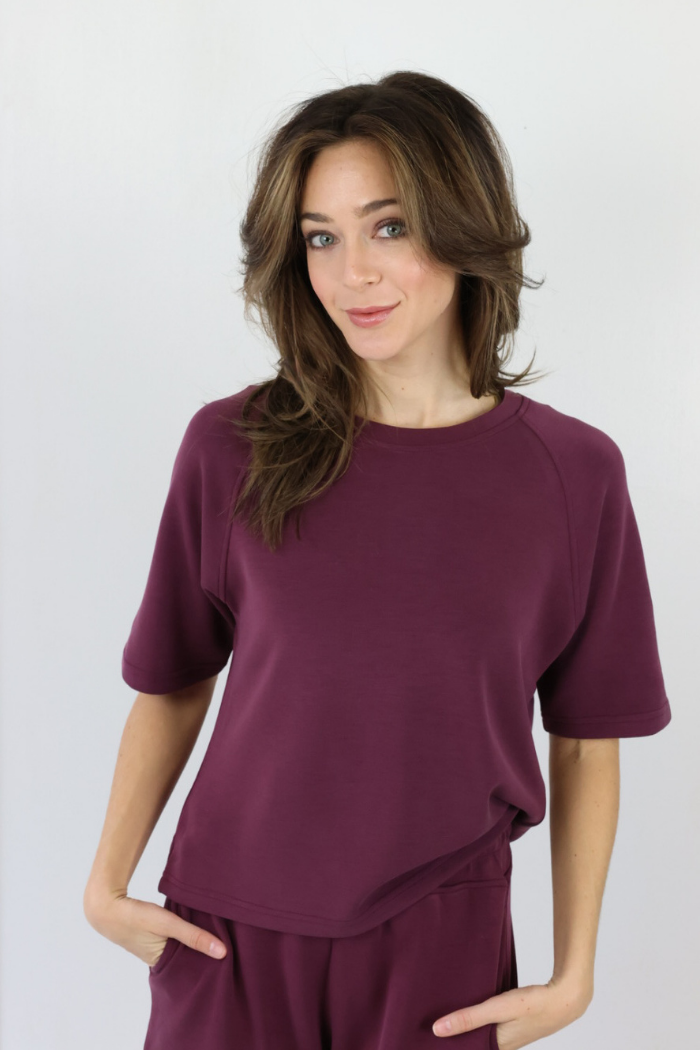 Elevate your everyday style with this purple Soft Drape Raglan Tee, crafted from a silky mid-weight modal blend that drapes perfectly on all shapes. The raglan sleeves add a sporty touch while the subtly relaxed fit makes it flattering for every frame. Style it with the matching sweat shorts or high waist jeans for a chic, casual look that feels effortlessly polished!