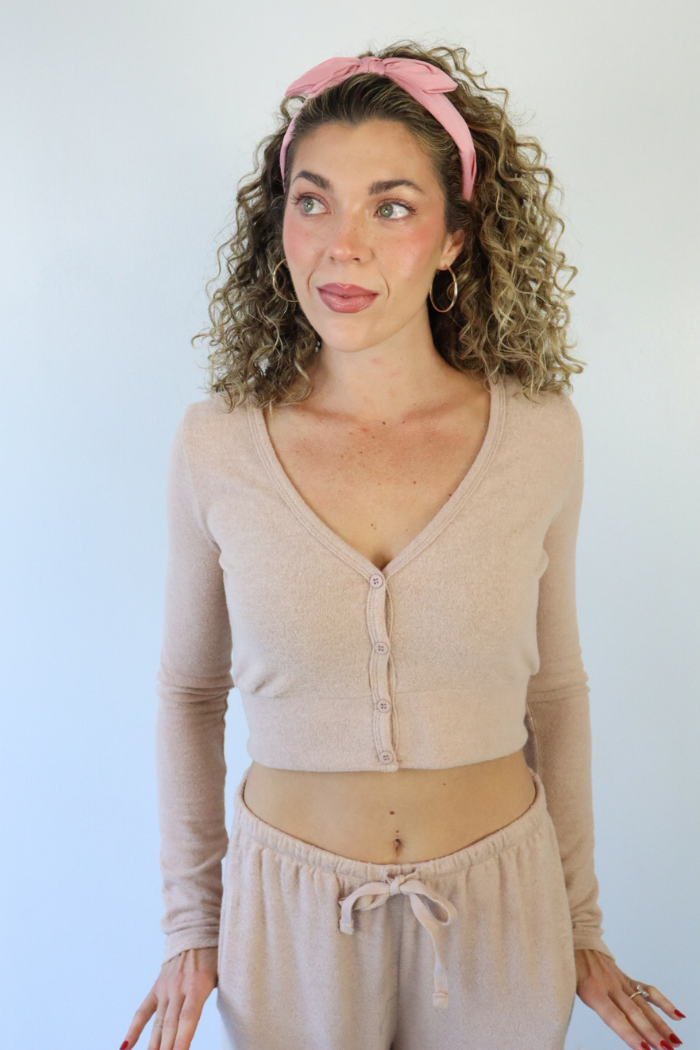 Keep it cozy and cute with the V-Neck Cropped Brushed Cardigan in Taupe! This soft neutral cardigan features a flattering v-neckline, long sleeves, and a trendy cropped fit for a relaxed yet put-together look. Pair it with the matching sweatpants for an effortlessly coordinated vibe or style it with high-waisted denim for a chic Nashville-inspired outfit. Perfect for all ages and seasons, this cardigan is timeless and cozy!