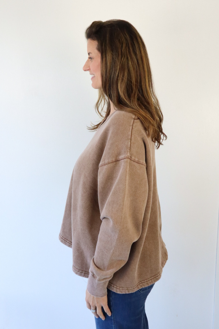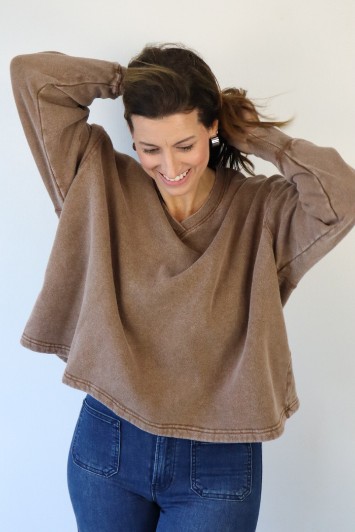 Elevate your everyday look with the V-Neck Washed Sweatshirt in Brown! This soft washed brown pullover combines timeless comfort with a hint of vintage charm. Designed with a relaxed fit, ribbed cuffs, and a subtle V-neckline, it’s perfect for layering over your favorite tee or under a jacket. Style it with jeans and sneakers for a laid-back Nashville vibe or dress it up with boots and accessories for an effortless chic look!