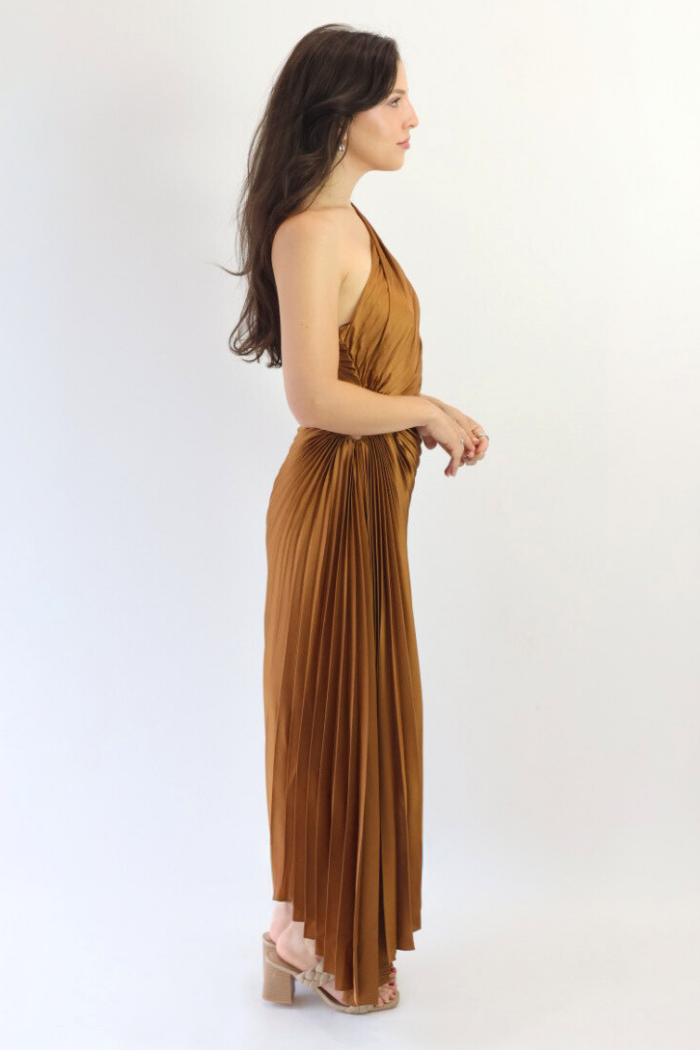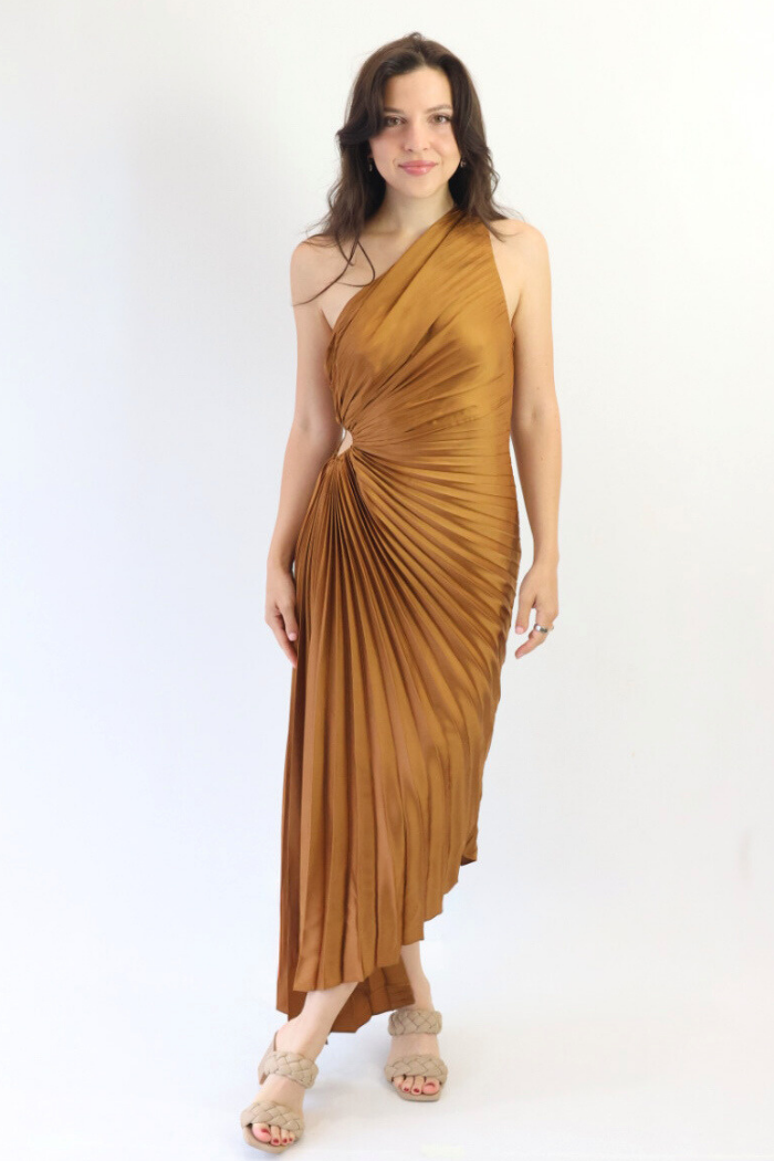 Turn heads in this stunning one-shoulder pleated keyhole dress in gold! Designed with an asymmetrical silhouette and all-over pleats, this maxi dress brings effortless elegance to any event. The side keyhole detail and flowy hem create a flattering, feminine look. Style it with gold heels and statement earrings for a night out or formal celebration!