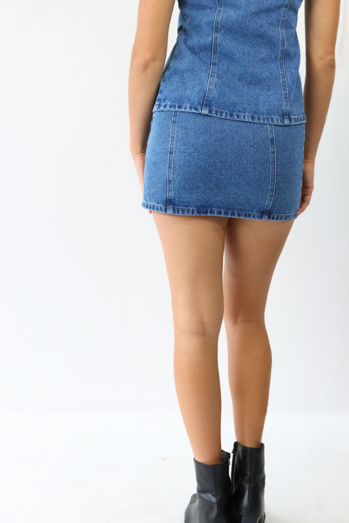 Show off your style in our Asymmetrical Denim Skirt! This trendy mini skirt adds an edgy twist to a classic look. Perfect for pairing with the matching denim button-up or styling solo with a cozy sweater and boots for fall. Its flattering fit and versatile design make it a must-have for your Nashville-inspired wardrobe. For a little extra length, we recommend sizing up!