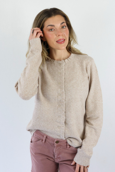 Button Down Ruffle Edge Cardigan in Oat