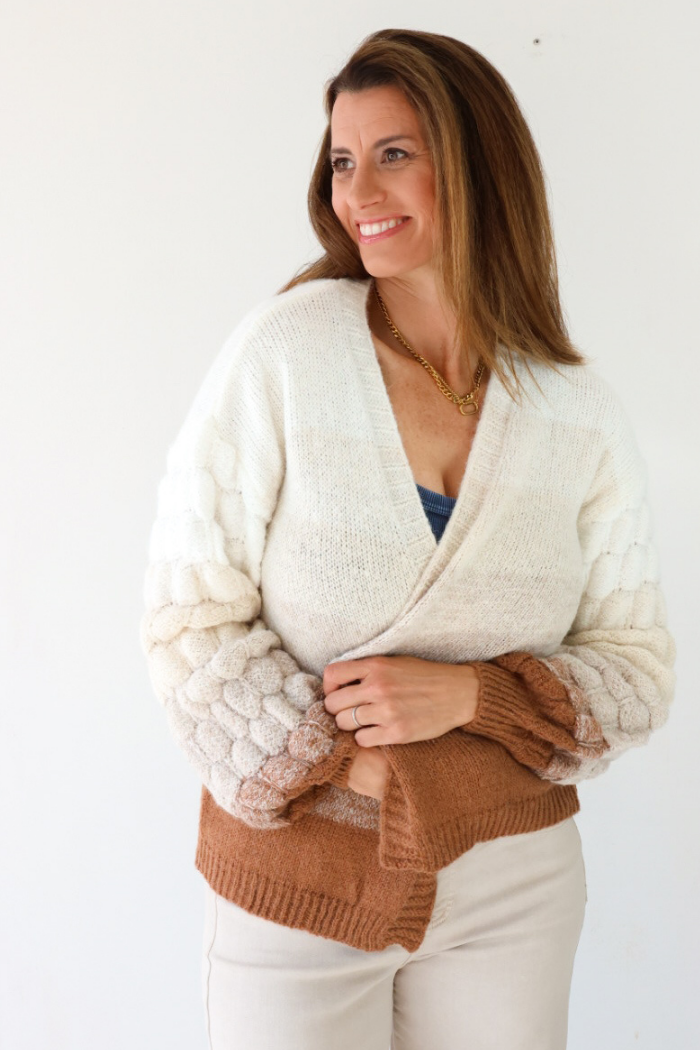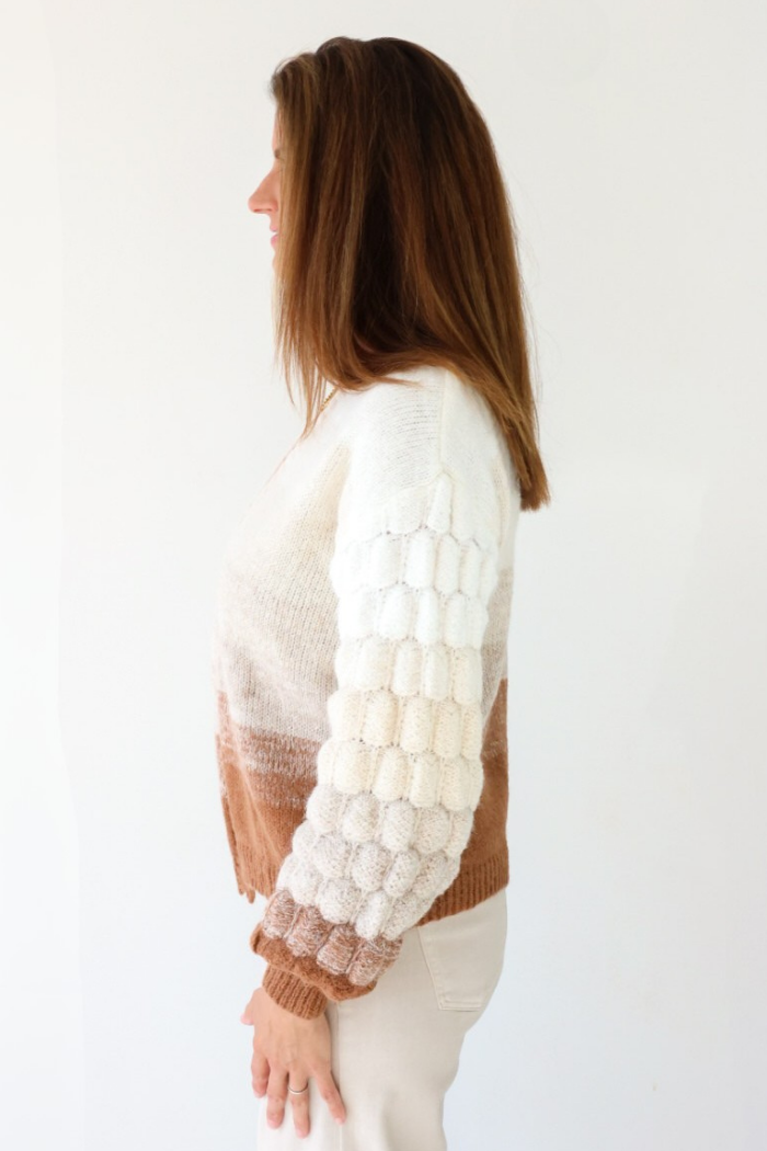 The Bubble Sleeve Open Front Cardigan in Cream is the cozy-chic layer your fall wardrobe needs! Designed with trendy colorblock details and bubble sleeves, this warm cardigan adds both texture and style to any look. Throw it over a simple tank with denim for casual days or layer with a fitted dress and boots for a more polished Nashville vibe!