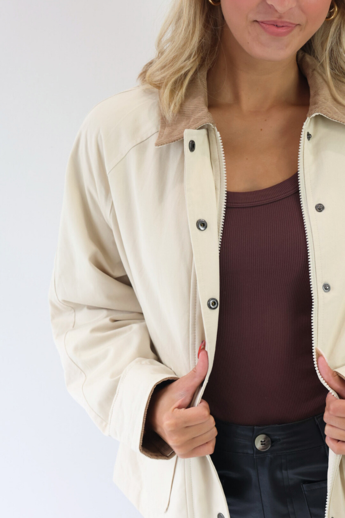 The perfect layering piece for the season, this cream barn jacket features a soft camel corded collar for a touch of timeless charm! Its relaxed fit makes it easy to style over cozy sweaters or lightweight knits for a chic, casual fall look. Pair with denim and boots for effortless Nashville-inspired style that keeps you warm and polished all day!