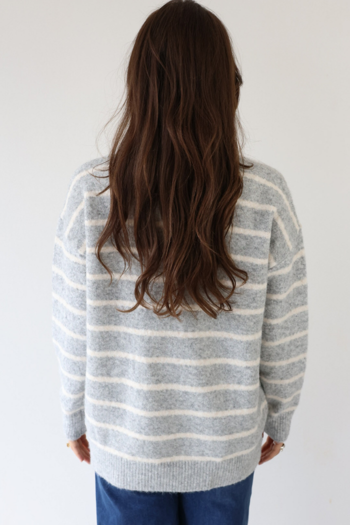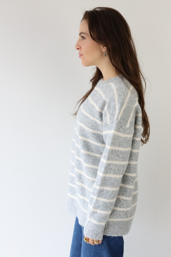 The Crew Neck Fuzzy Striped Sweater in Grey is a cozy wardrobe essential that combines timeless style with soft comfort. Its classic stripes and long, relaxed fit make it perfect for layering over jeans or leggings for a chic, everyday look. Pair with boots and delicate jewelry for an effortlessly trendy outfit suitable for women of all ages, keeping your winter style elevated and comfortable!