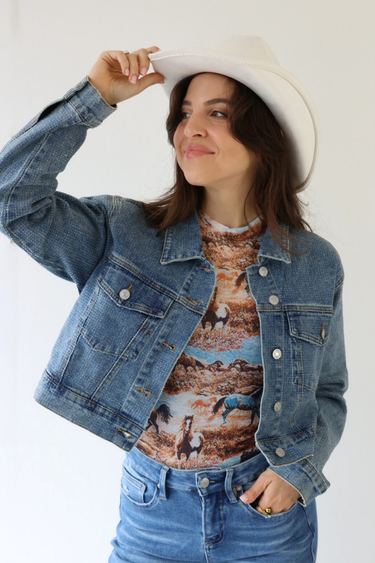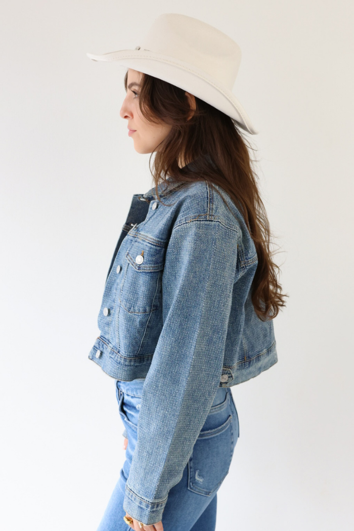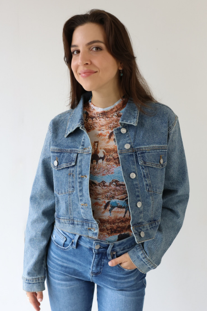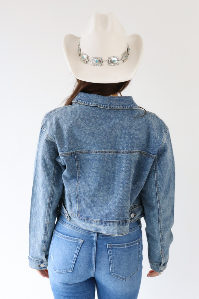 Shine on Broadway in the Crystal Cropped Denim Jacket featuring a medium wash that blends Nashville charm with modern, trendy style. Its bold sparkle and relaxed fit make it easy to layer over dresses, tanks, or graphic tees for a look that works for all ages. Pair it with high rise denim or a chic mini to create a standout outfit for day or night!