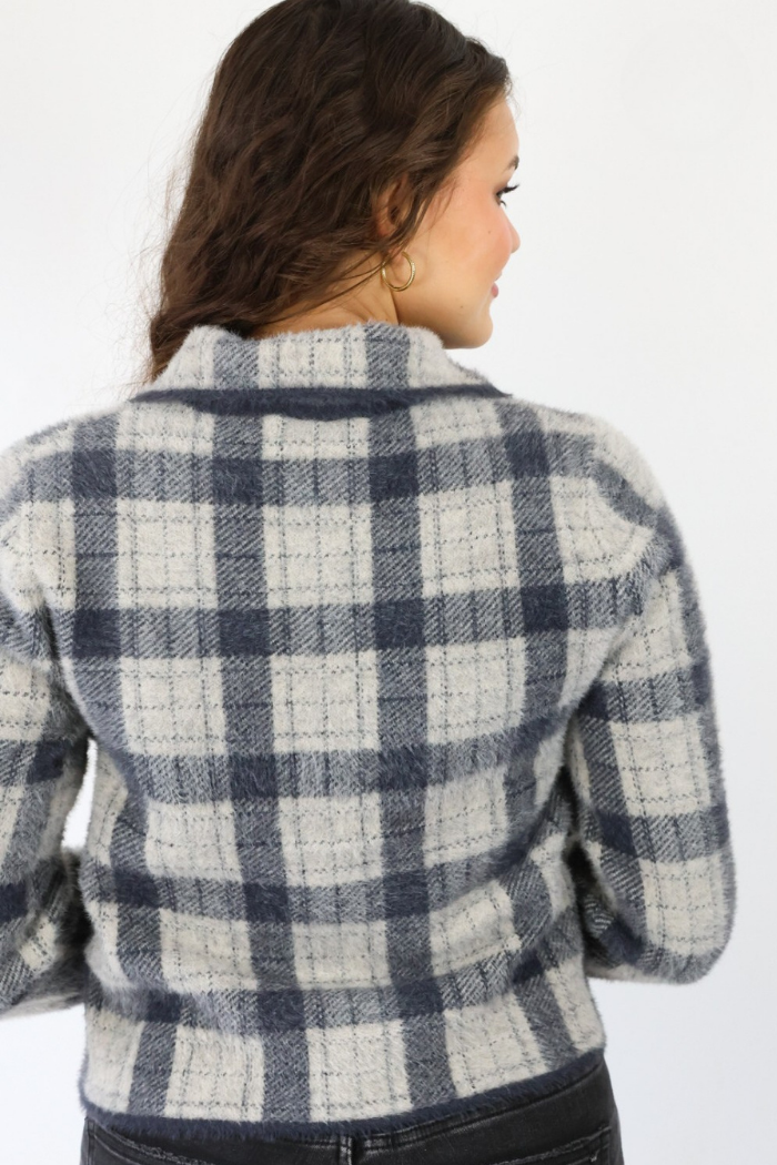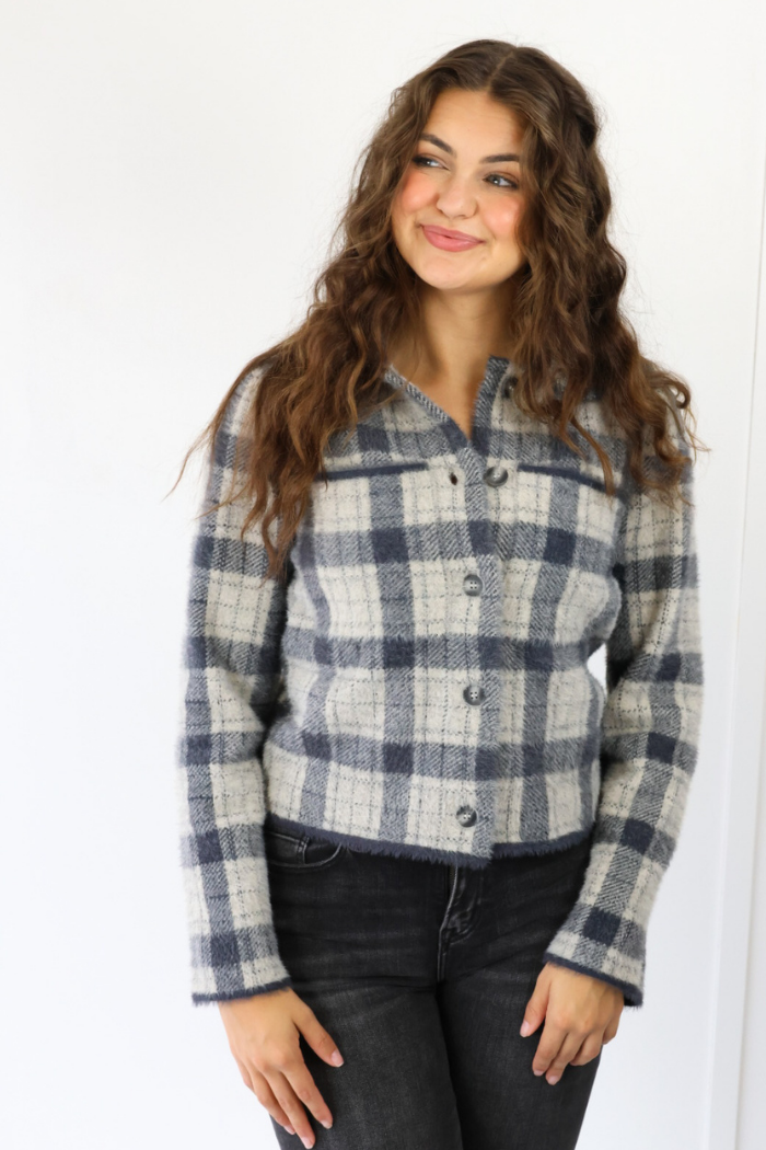 Stay warm and stylish with our Eyelash Plaid Jacket in Charcoal! Featuring a soft eyelash texture and a chic grey and blue plaid design, this button-up jacket is the perfect mix of cozy and trendy. Ideal for layering over a basic tee or chunky sweater, it adds effortless Nashville flair to any outfit. Pair it with denim and boots for the ultimate cool-weather look that stands out all season!
