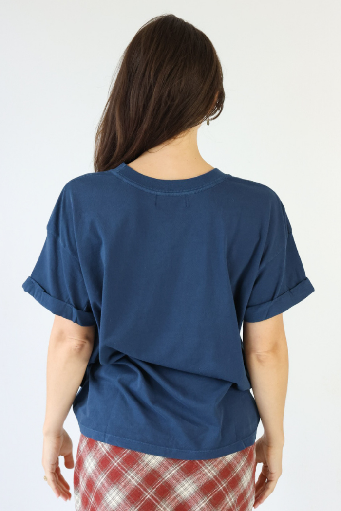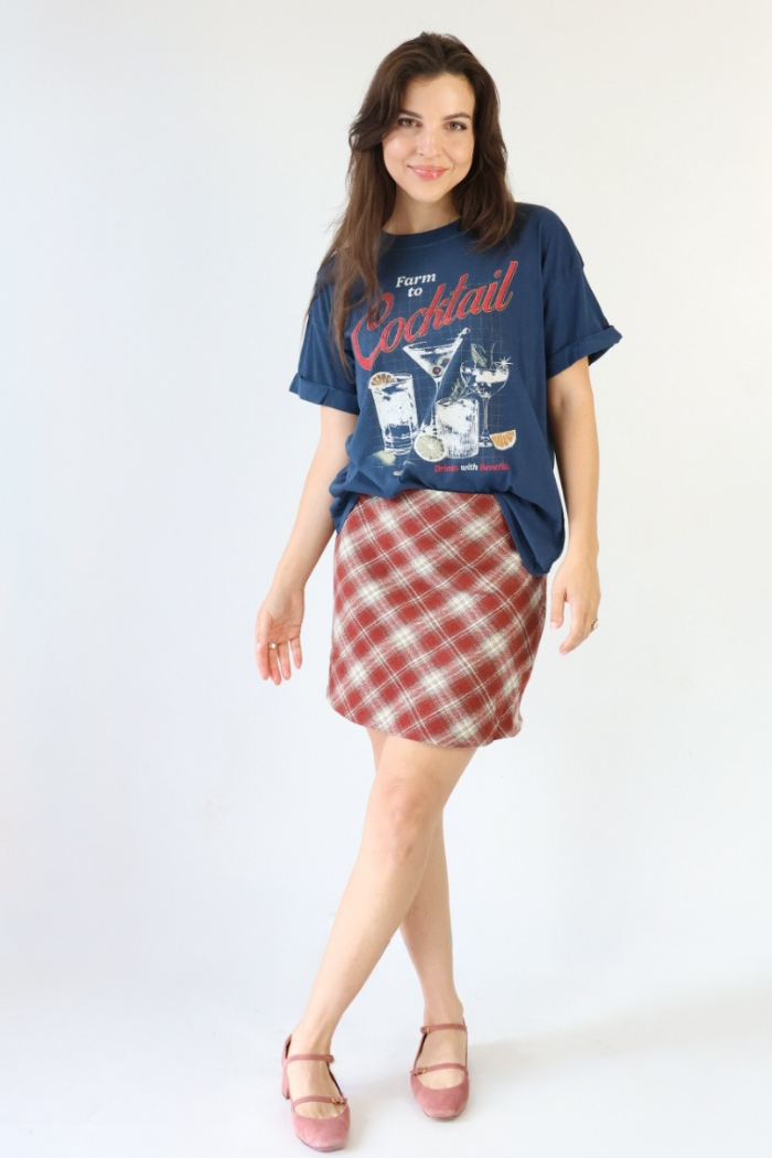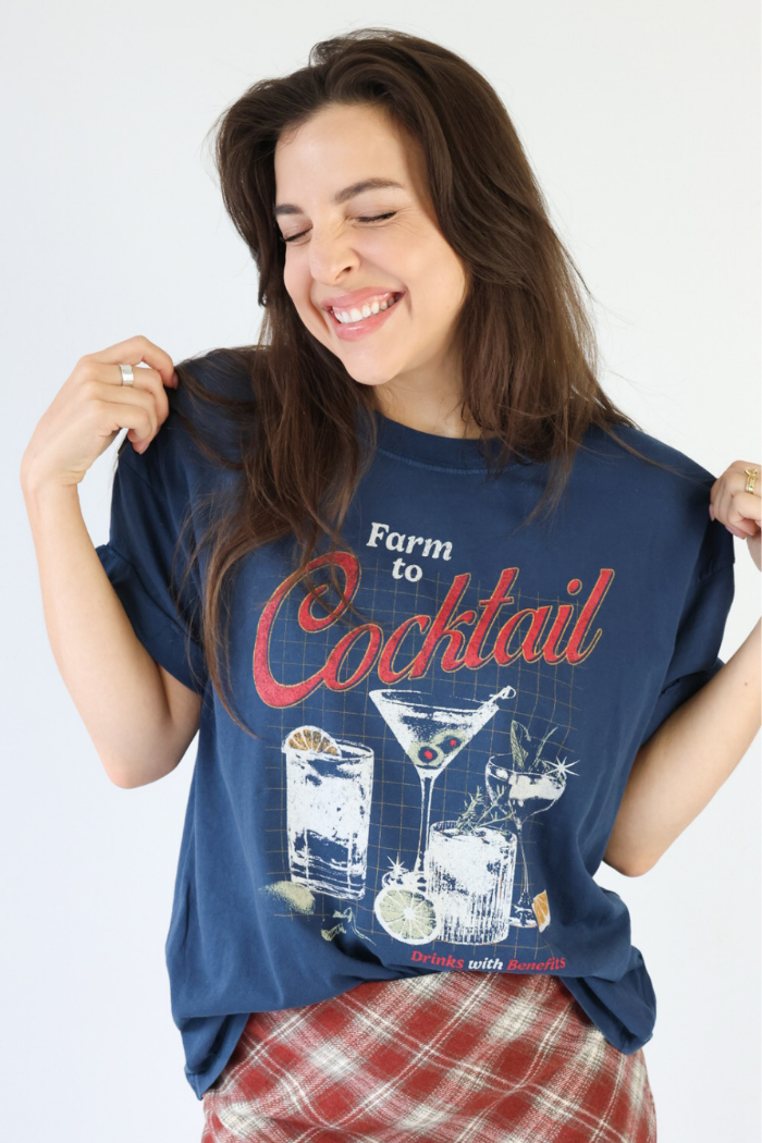 Make a statement in our Farm to Cocktail Tee in Navy! This cute graphic tee is perfect for year-round wear, combining casual comfort with trendy Nashville style. Pair it with jeans and cowgirl boots for a relaxed day look or dress it up with a plaid skirt and gold jewelry for festive holiday vibes. Its versatile design makes it a must-have for women of all ages looking to add playful, stylish pieces to their wardrobe!