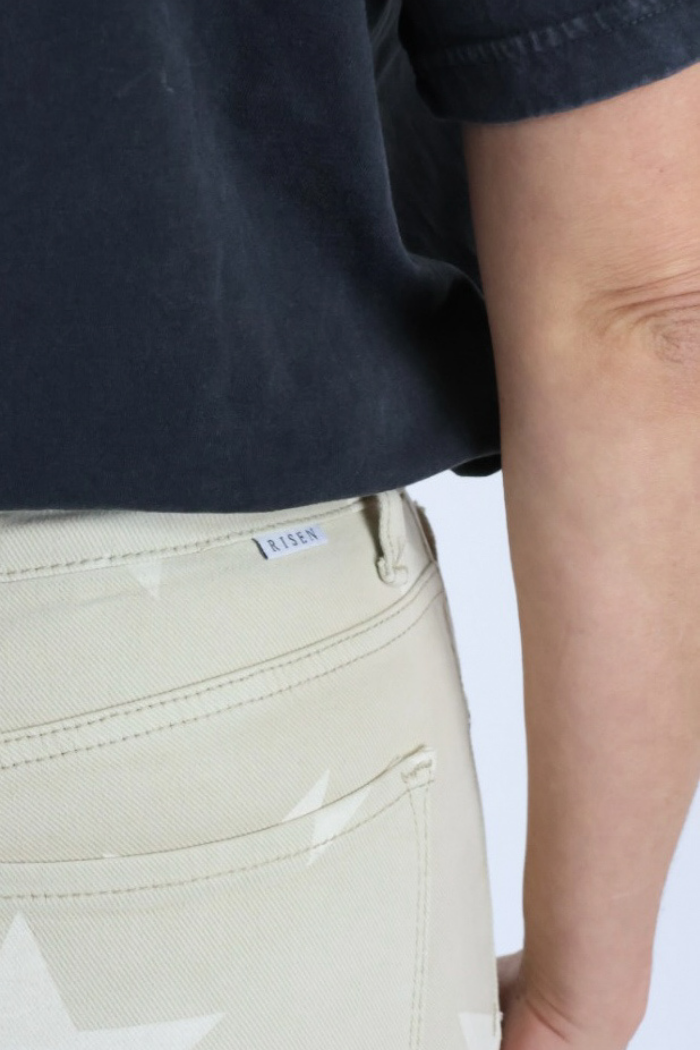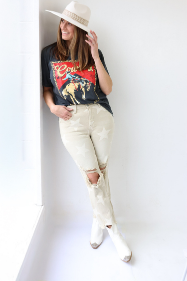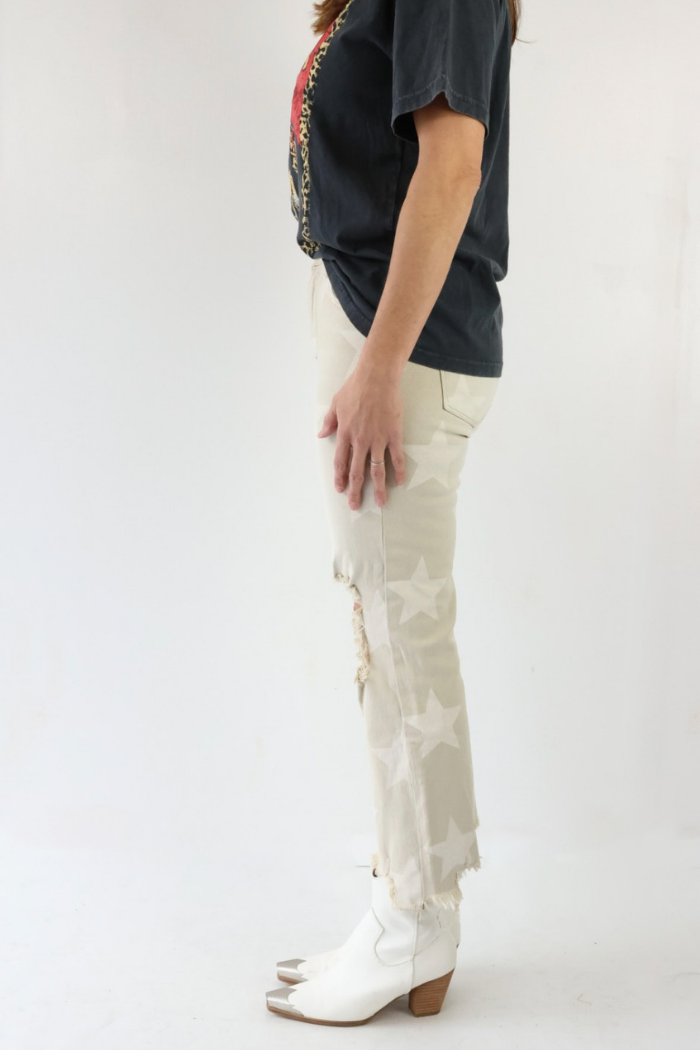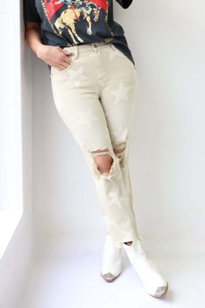 Shine bright in Nashville with this star print distressed cropped denim in a versatile khaki tone, designed for trendy women of all ages who love standout style. Featuring a flattering high-rise waist, straight leg fit, and cropped length, these jeans offer a modern edge with effortless comfort. Style them with a graphic tee and sneakers for daytime exploring, or pair with a western top and boots for downtown nights that feel bold, playful, and perfectly Music City chic!