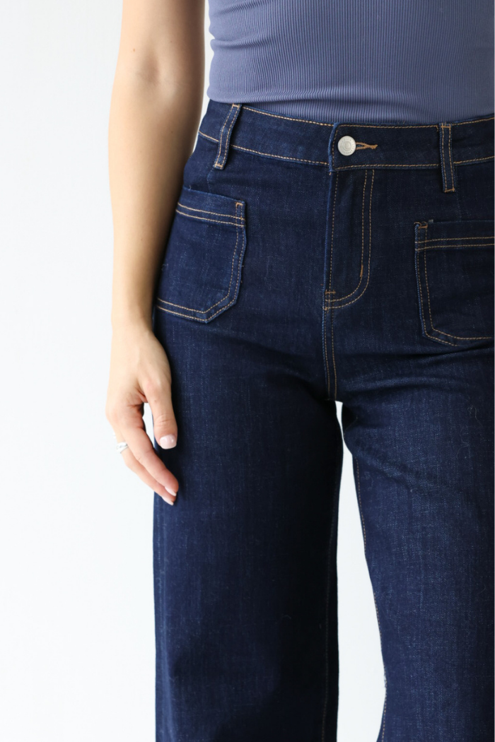 High Rise Wide Leg Patch Pocket Denim in Dark Wash