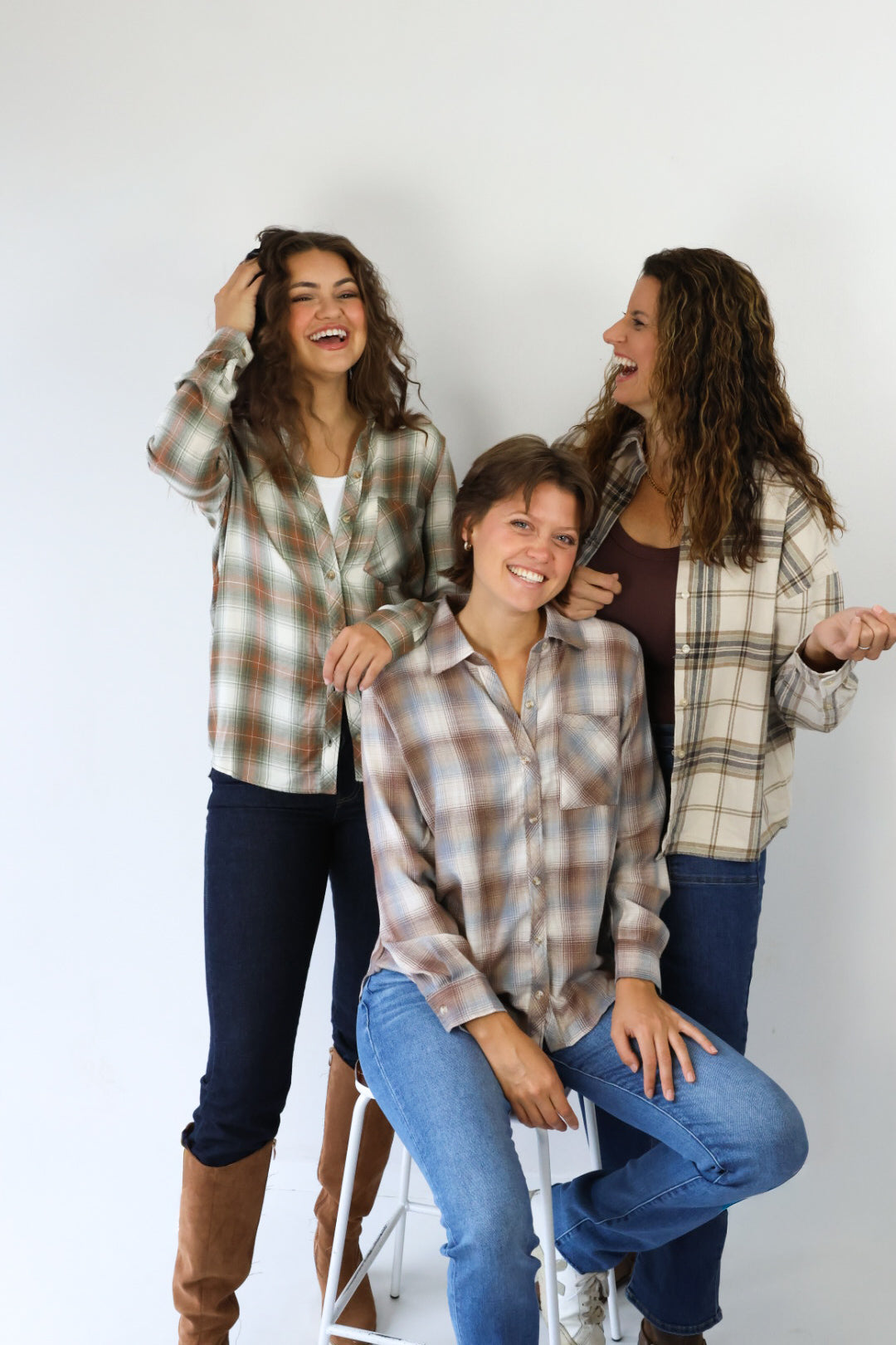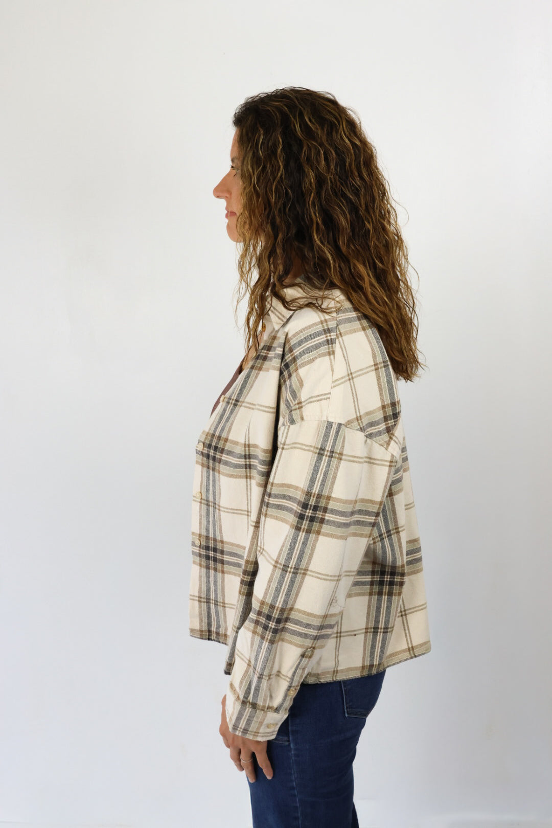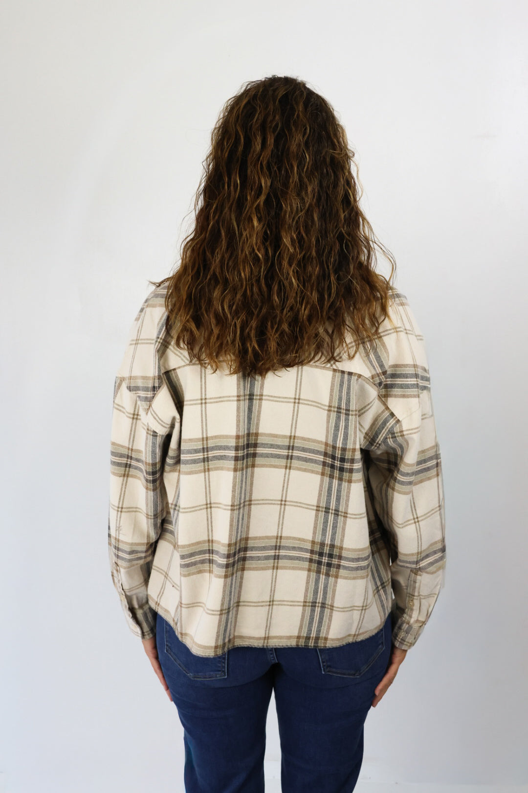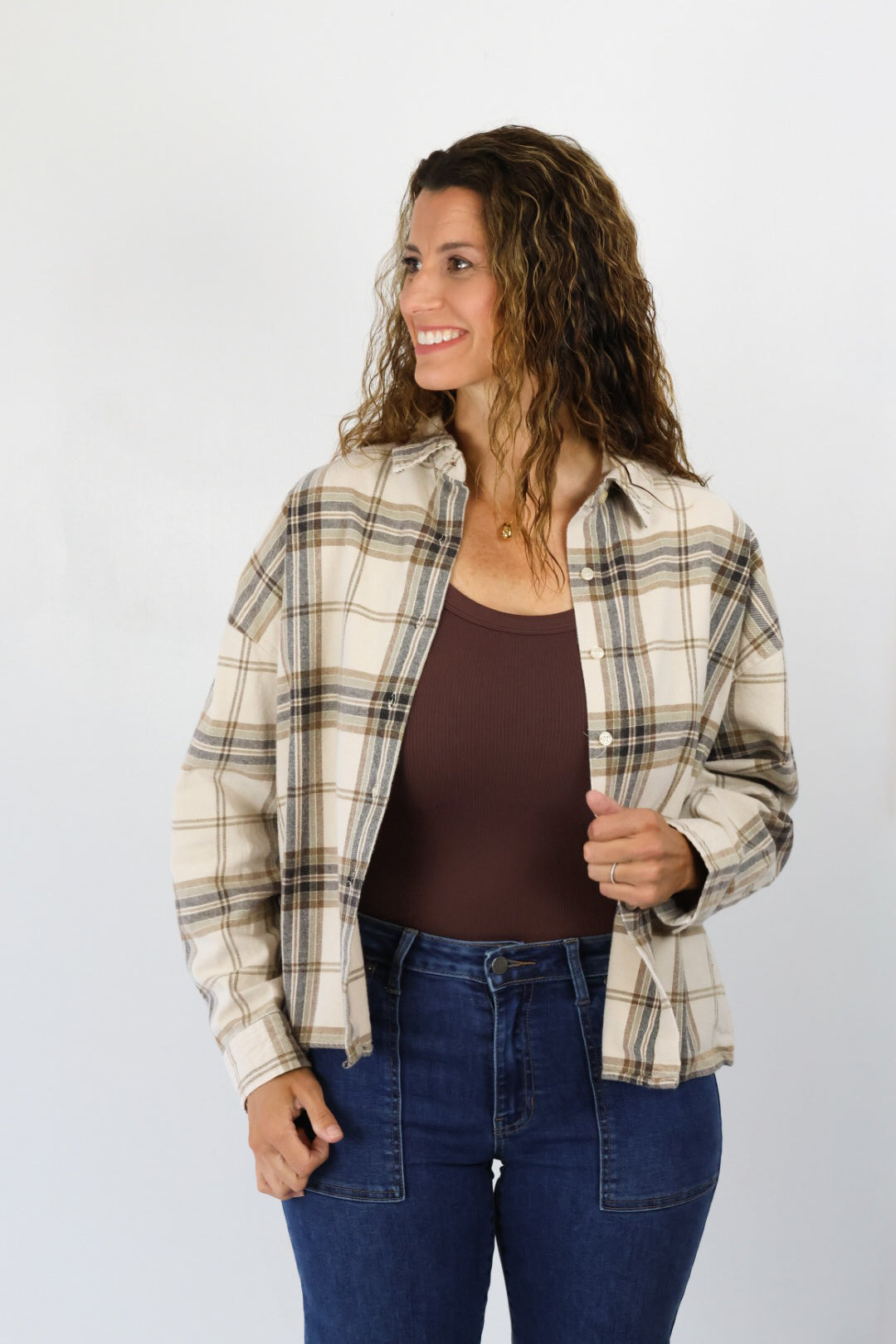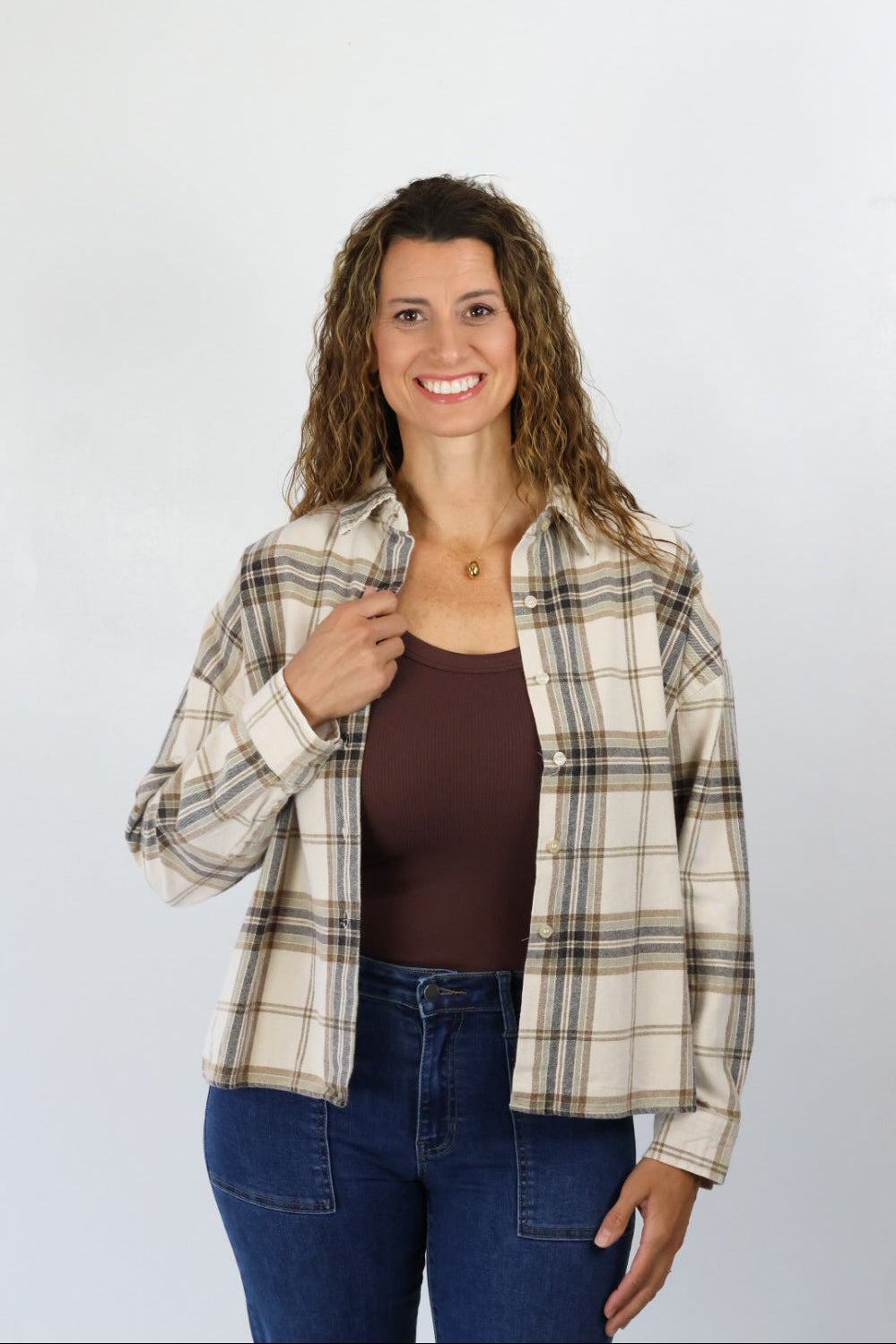 Effortlessly cool and timeless, our Button Down Plaid Shirt in Khaki is the perfect mix of laid-back and chic! Designed with a boxy silhouette and slightly cropped length, it pairs flawlessly with high-waisted denim for a relaxed yet polished look. The long sleeves and neutral plaid pattern make it a must-have for layering through every season!