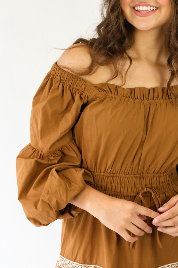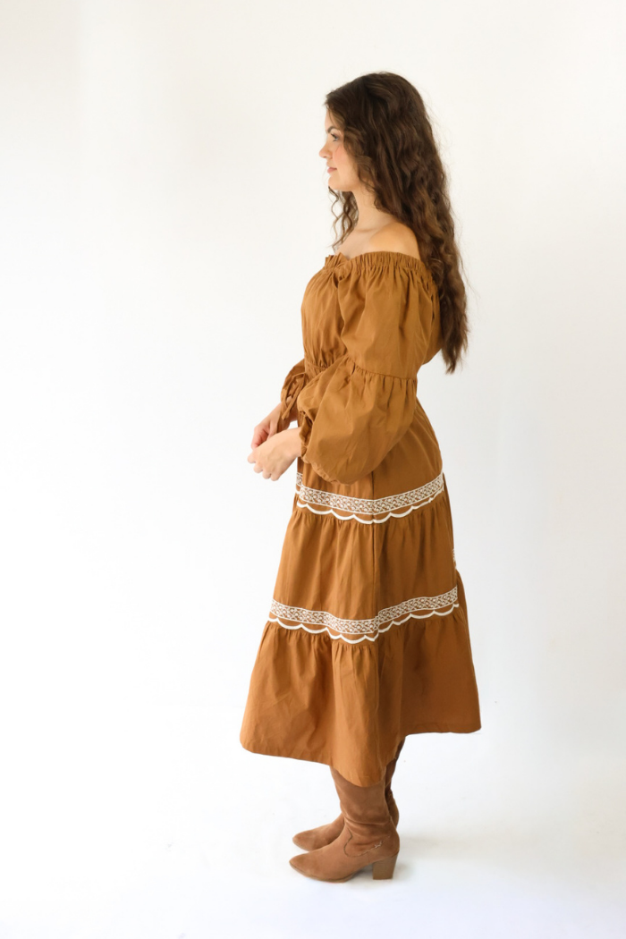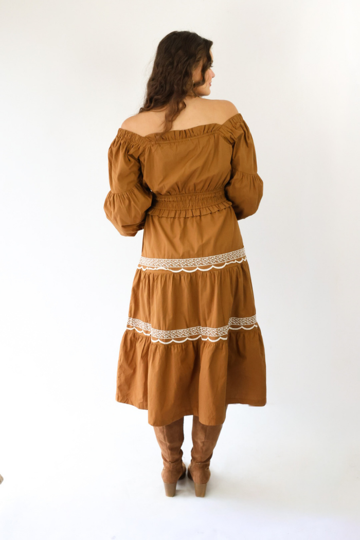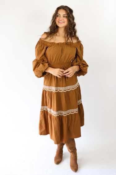 Turn heads this fall in our Embroidered Lace Midi Dress in Brown! Featuring delicate lace detailing and romantic off-the-shoulder puff sleeves, this dress perfectly blends charm and sophistication. The 3/4 sleeves and rich brown hue make it ideal for pumpkin patch outings, date nights, or fall events. Style it with heeled boots and a wide-brim hat for a dreamy seasonal look!