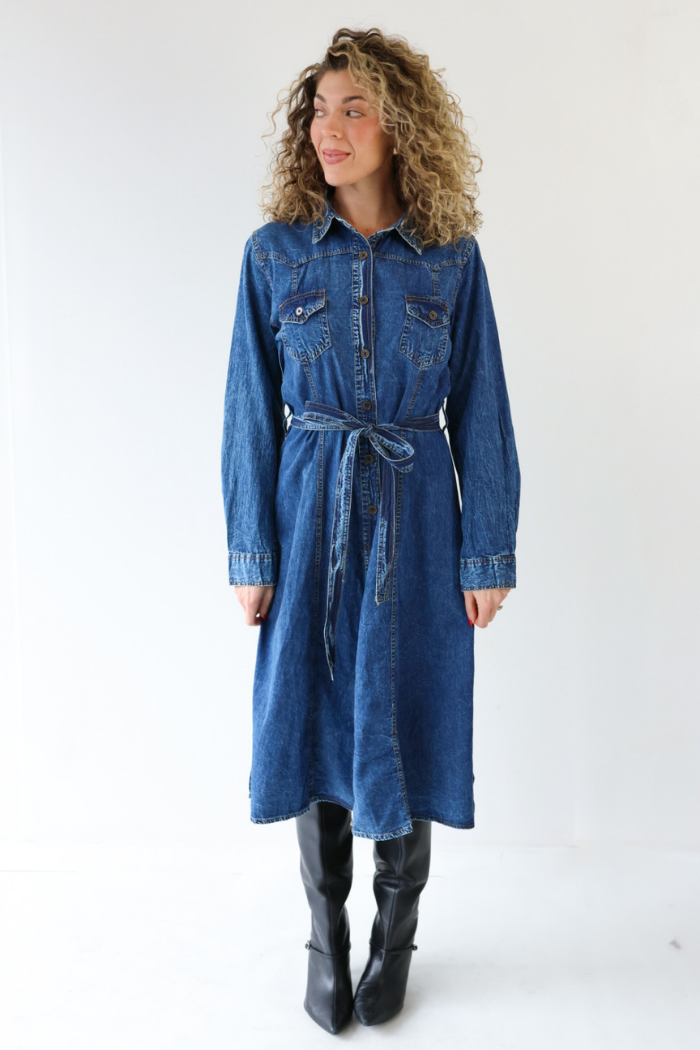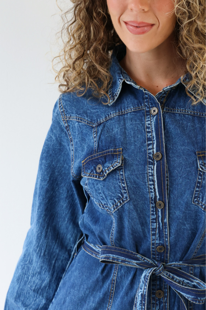 Effortless style meets comfort with this long sleeve mineral wash denim dress featuring a classic button down front. Its versatile design flatters all ages and works perfectly for Nashville inspired outfits, pairing effortlessly with boots or sneakers. Layer with a belt for a more defined silhouette or wear loose for relaxed charm. Ideal for day to night looks that are casual, trendy, and chic!