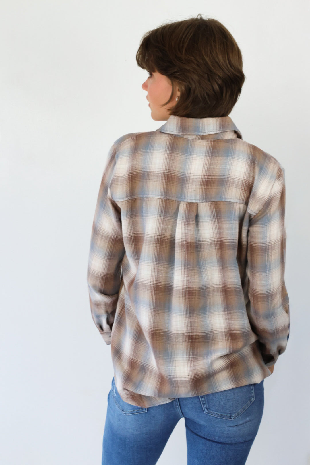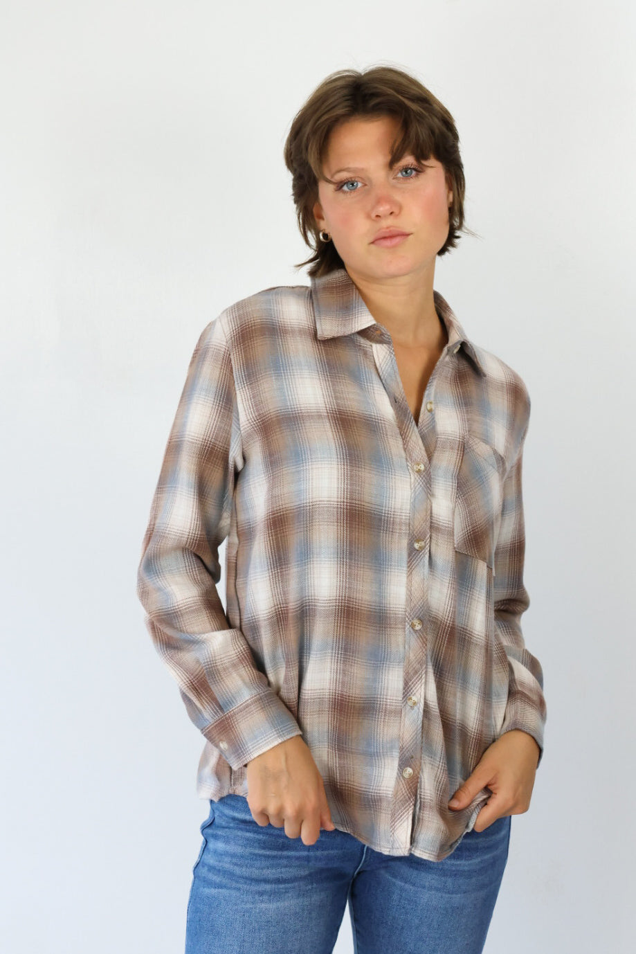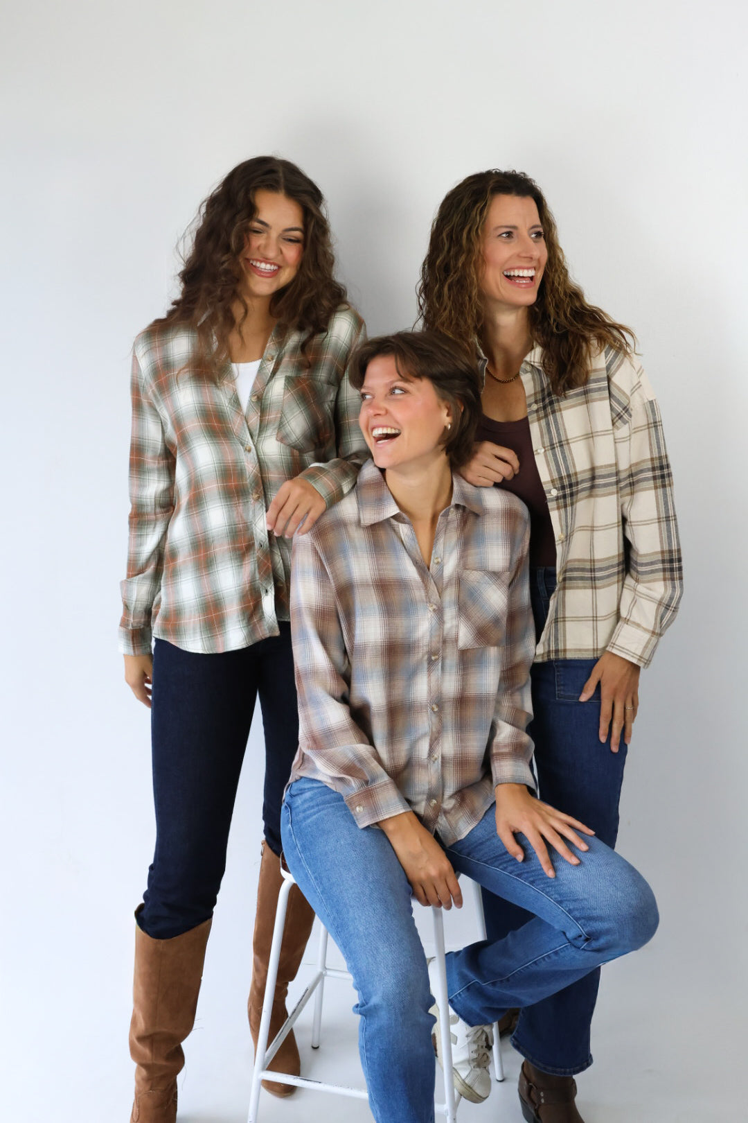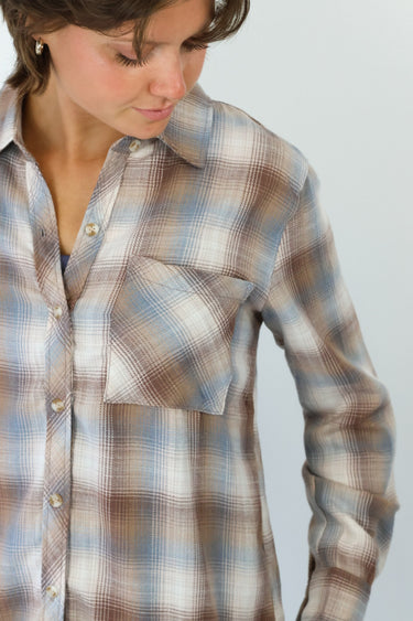 Layer up in effortless fall style with the Plaid Boxy Shirt in Taupe! This long sleeve button-up top features a relaxed, boxy fit in a chic mix of blue, brown, and taupe plaid tones. Perfect for layering over a tee or turtleneck, it’s an easy go-to for casual days, coffee runs, or weekend adventures. Pair it with denim and boots for that perfect Nashville fall look!