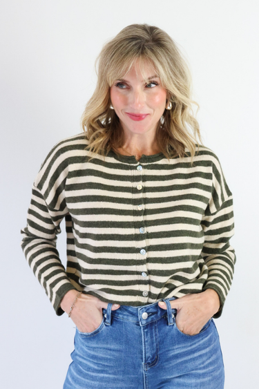 The Olive Striped Cardigan in Olive is the perfect blend of cozy and chic for any season! Designed with a classic round neckline, button-down front, and long sleeves, this striped sweater cardigan adds effortless style to your everyday look. Pair it with a fitted tee and denim for casual days or layer it over a dress for a trendy Nashville-inspired outfit everyone will love!