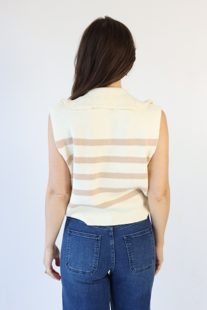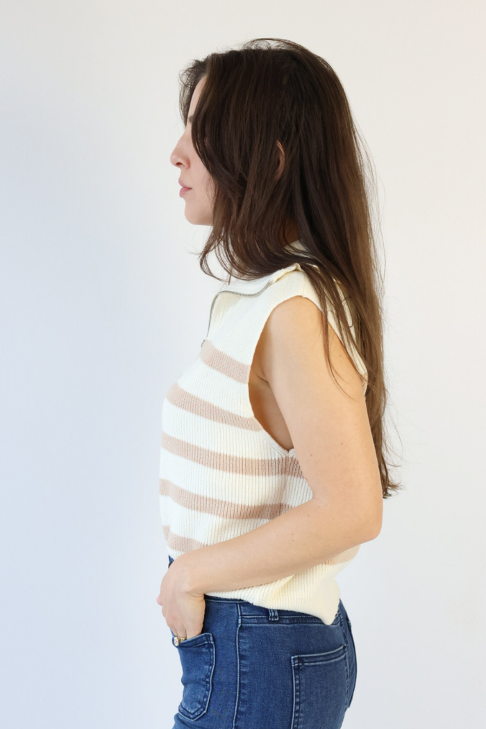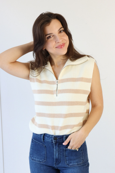 Stay effortlessly stylish in our Quarter Zip Striped Sweater in Cream! This sleeveless sweater features a chic cream and taupe striped design, perfect for layering over long-sleeve tees or pairing with high-waisted jeans for a polished Nashville look. Dress it up with a skirt and boots or keep it casual with pants and sneakers. Its versatile style makes it a must-have piece for women of all ages looking to elevate their wardrobe!