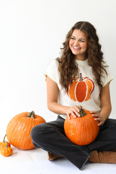 Celebrate the season in style with the Short Sleeve Pumpkin Sweater, the perfect cozy piece for your fall wardrobe. This cream sweater features an adorable pumpkin design on the front, adding a festive touch to any outfit. With its short sleeves and soft knit feel, it’s ideal for layering over a long sleeve or wearing solo on warmer autumn days. Pair it with jeans and booties for a cute and trendy Nashville-inspired fall look!