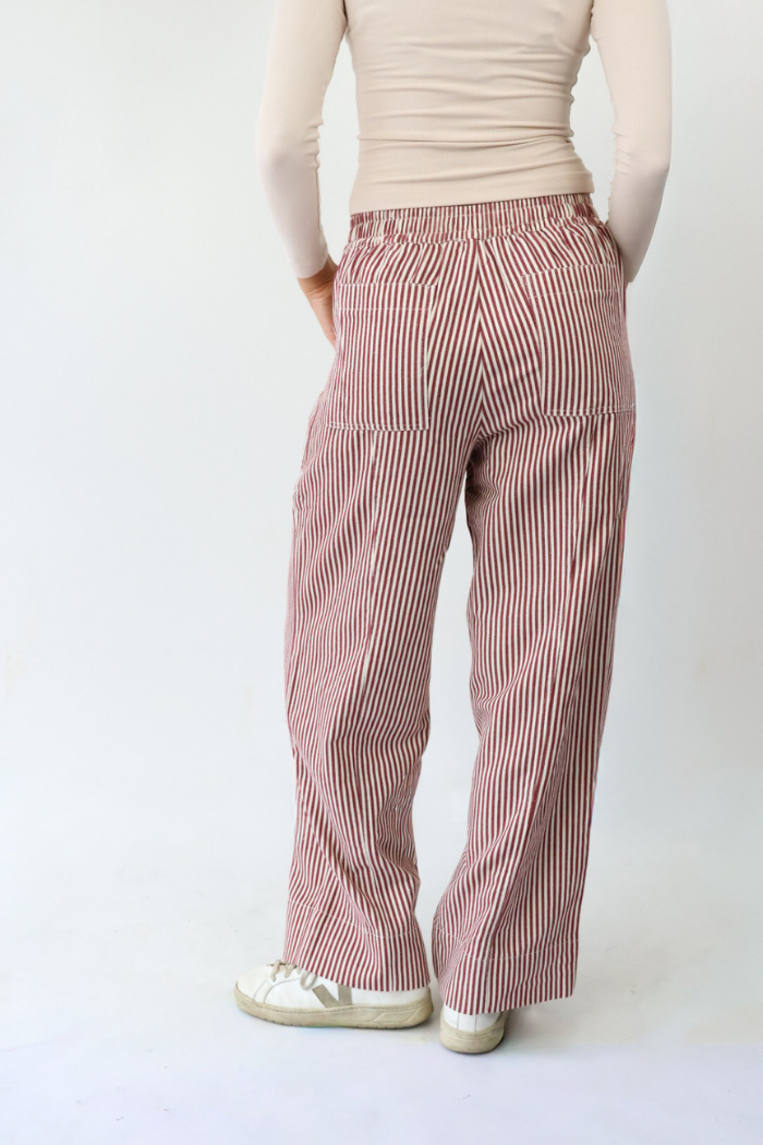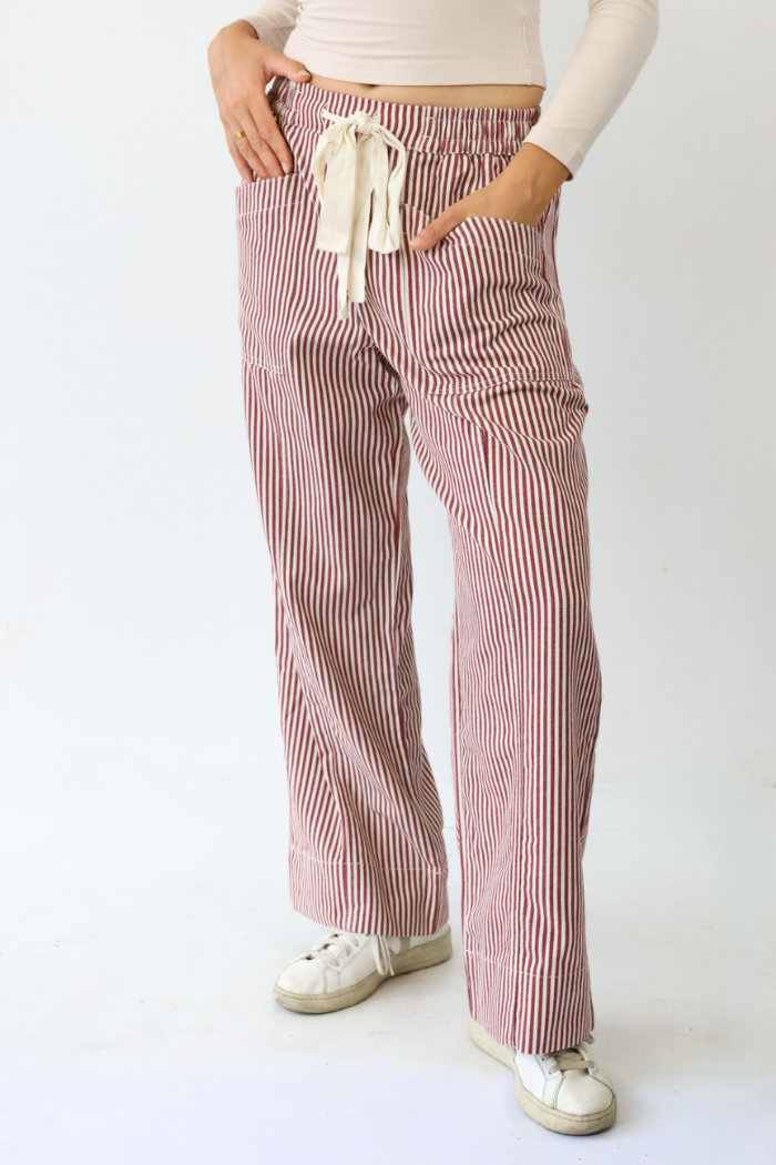 Make a bold statement this season with our Striped Wide Leg Pants in Red! Featuring a flattering tie waist and effortless wide leg silhouette, these chic trousers blend comfort and style for the perfect fall look. Pair them with a fitted turtleneck and boots for a trendy Nashville vibe or dress them up with a blouse for an elevated, polished finish. Effortlessly stylish and endlessly versatile!